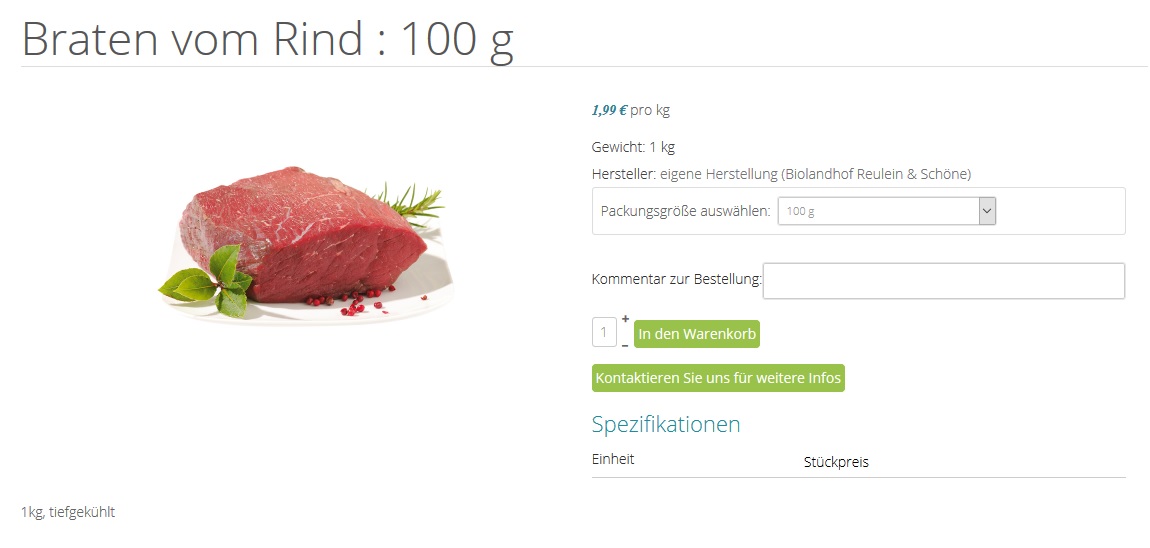 I want to give the customer the choice, wich pack size he wants to buy, the price must be calculated automatically, I only want to enter the price per kg manually. If the price per kg is 20€, the 100g-pack shall cost 2€ and the 500g-pack shall cost 10€. I found out, this can be done with the variants. I generated 5 variants: 100g, 200g etc. and gave each a percentage-price (10%, 20% etc.). So far, so good.