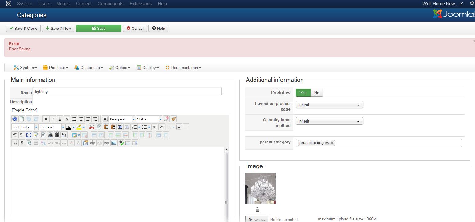 You category is "Lighting" and you were selecting "Lighting" as parent category, that can't work ;)