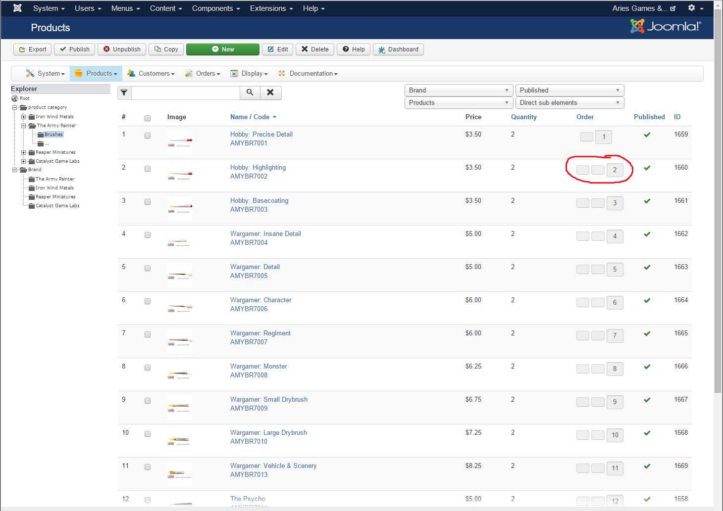 I used to be able to move a product up or down using arrow buttons next to it's product ID. I know the display has to be set on direct sub elements...but it's still not working. I haven't used this feature in a while, but evidently something has changed. Please see the screen shot, the up & down arrow buttons would be the ones circled in red...but they don't work & the arrows are now gone. Also...I cannot manually enter the numerical number in the box.