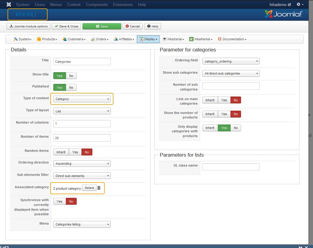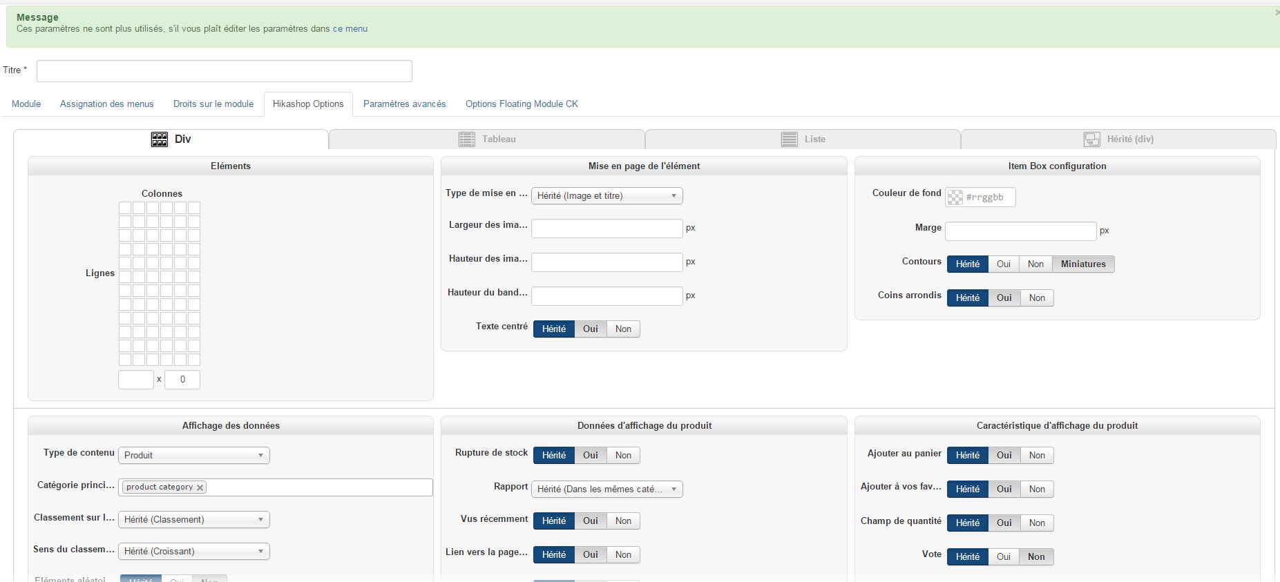 When I create a Hikashop contenu module as noticed my the demo website, I don't have this screen.