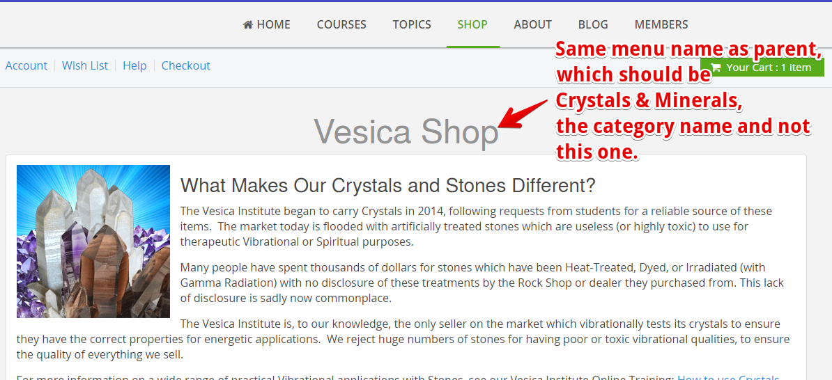 For have right title when click on "Crystals & Minerals" from "Shop" Menu, just change "product categories" name to "Vesica Shop" (In your categorie backend configuration.