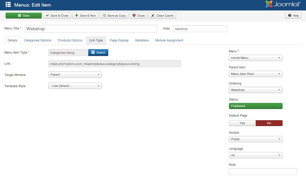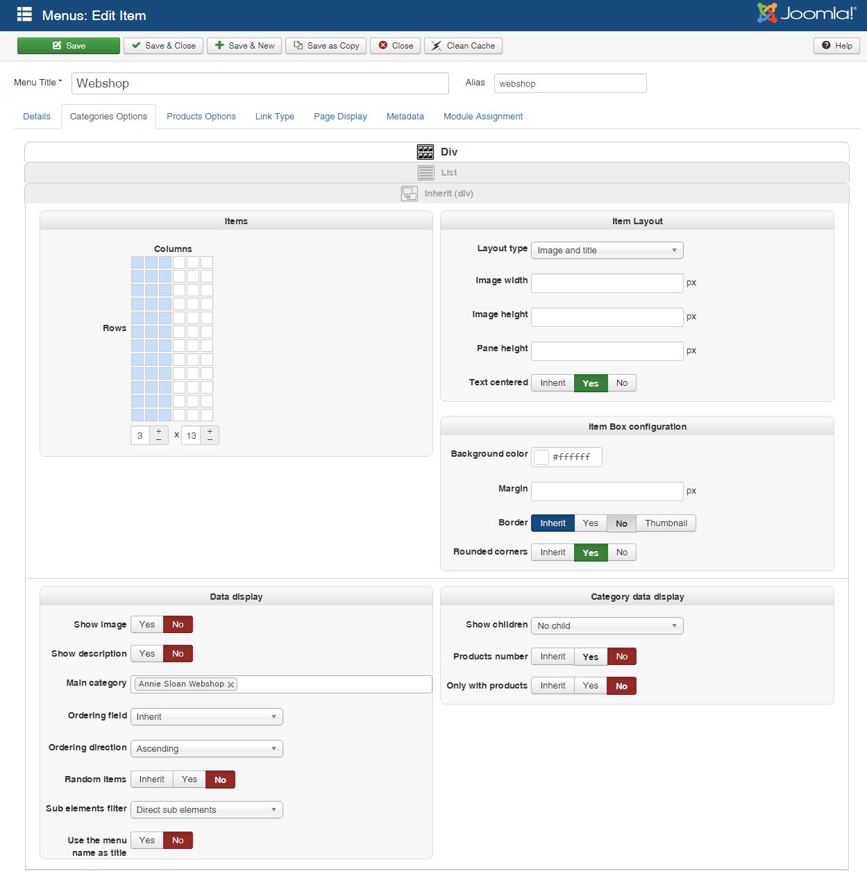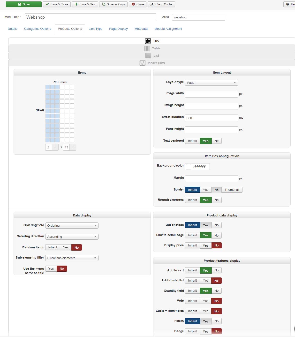 I have set the menu-item to Categories listing and on the tab Product Options I have set the Item Layout to Fade.
