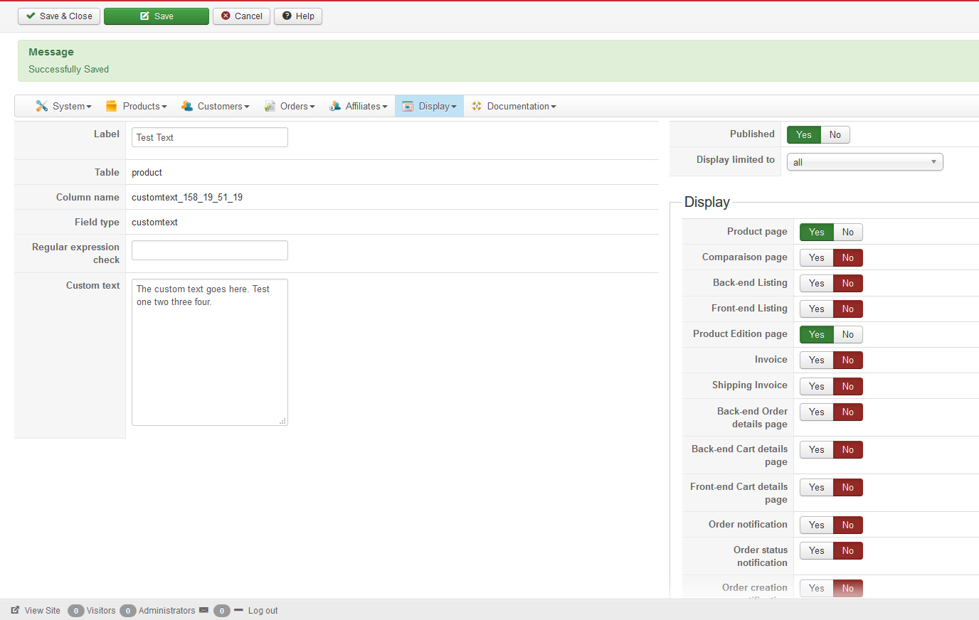 So if it's a custom field of the table "product", it will allow you to display custom text on the product edition form (and thus that text won't appear on the product page of the frontend).