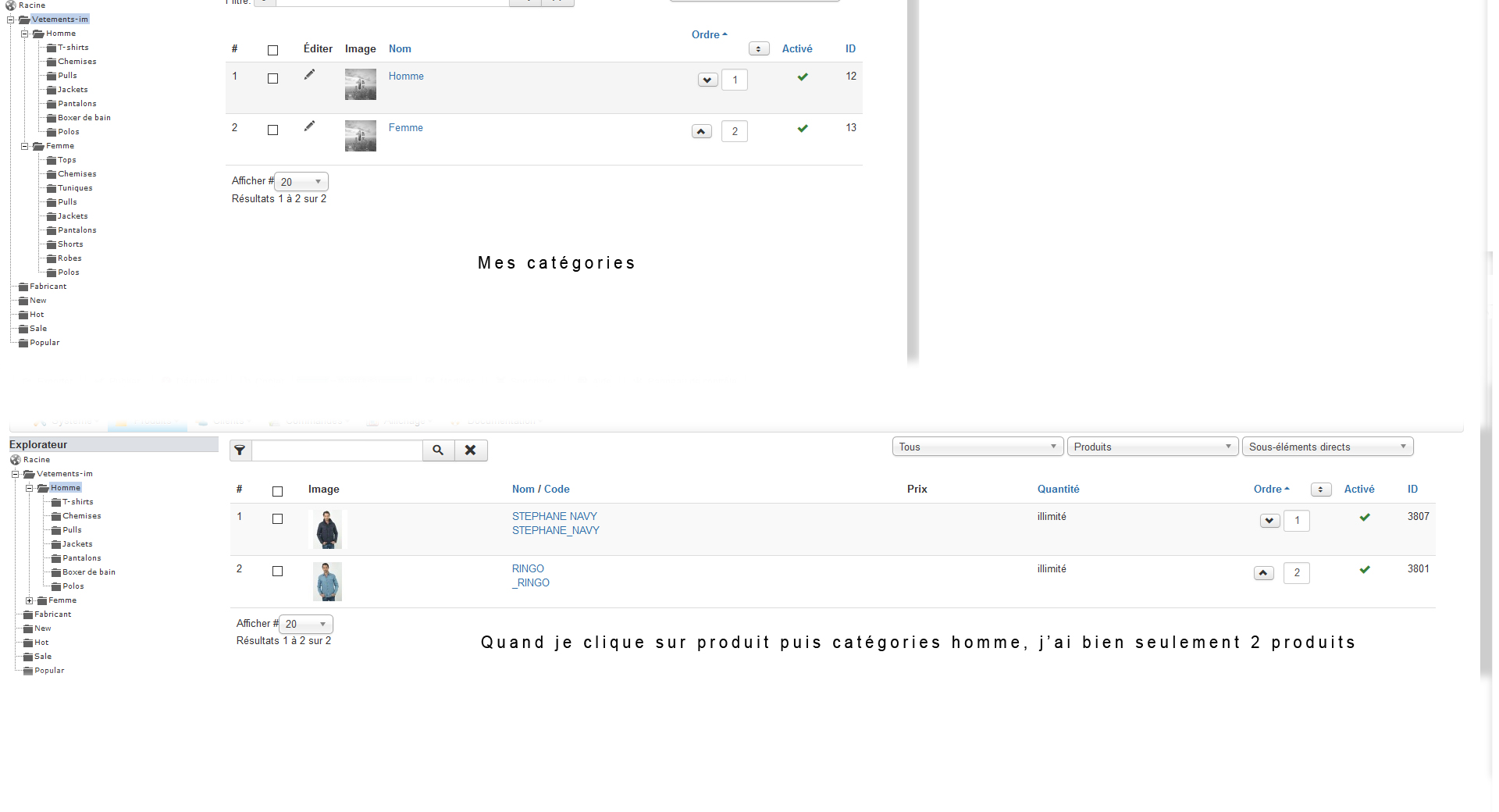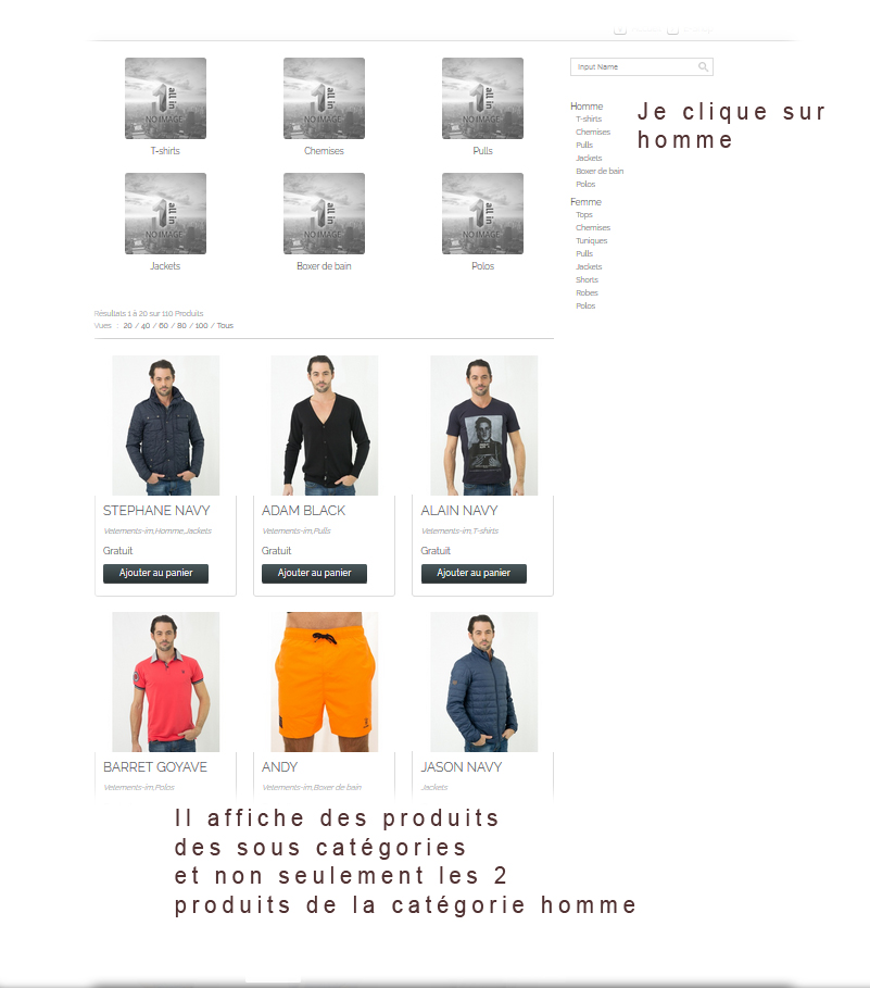 Si je clique sur les produits de la catégorie homme, je vois des produits de la catégorie Femme.