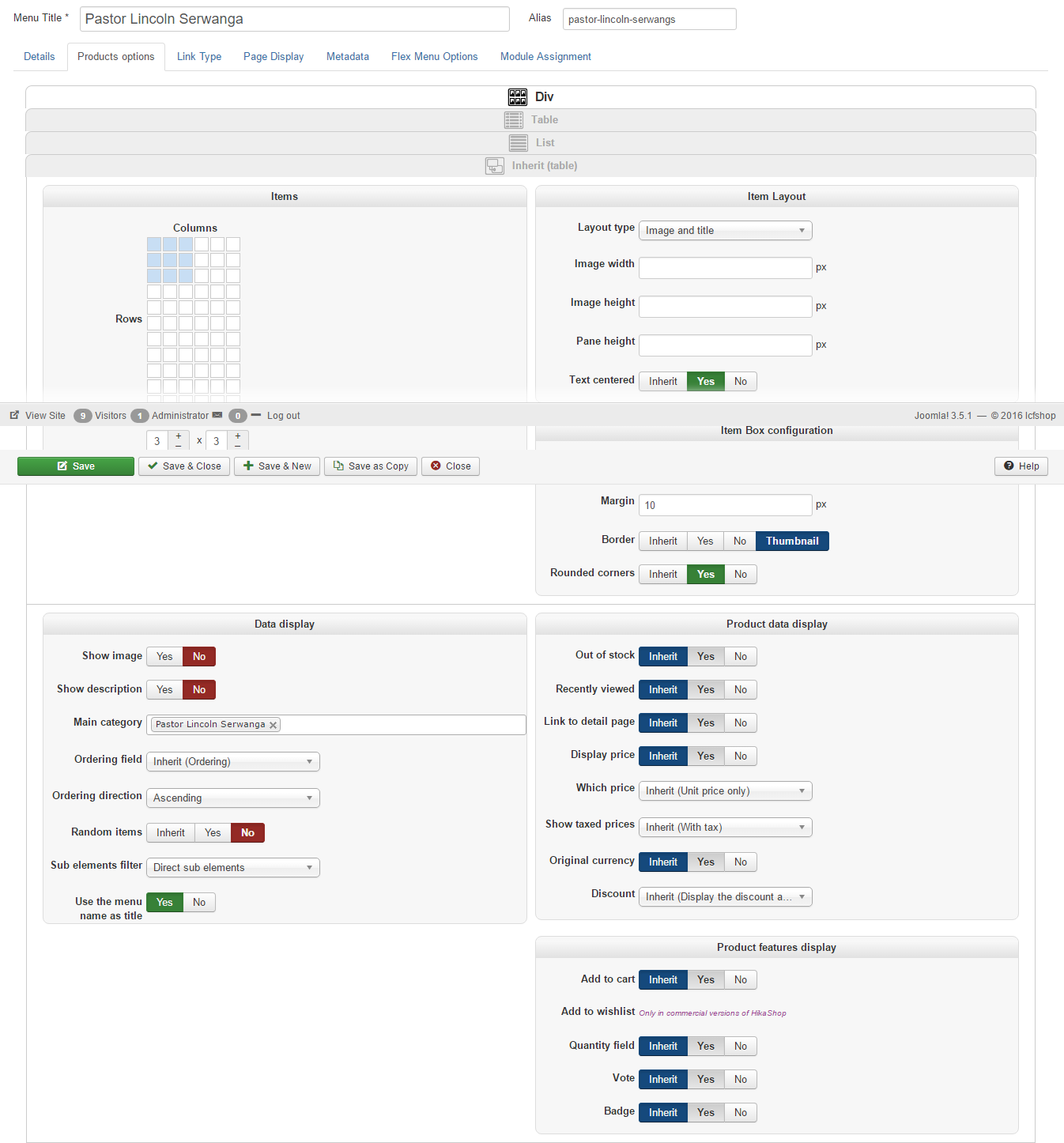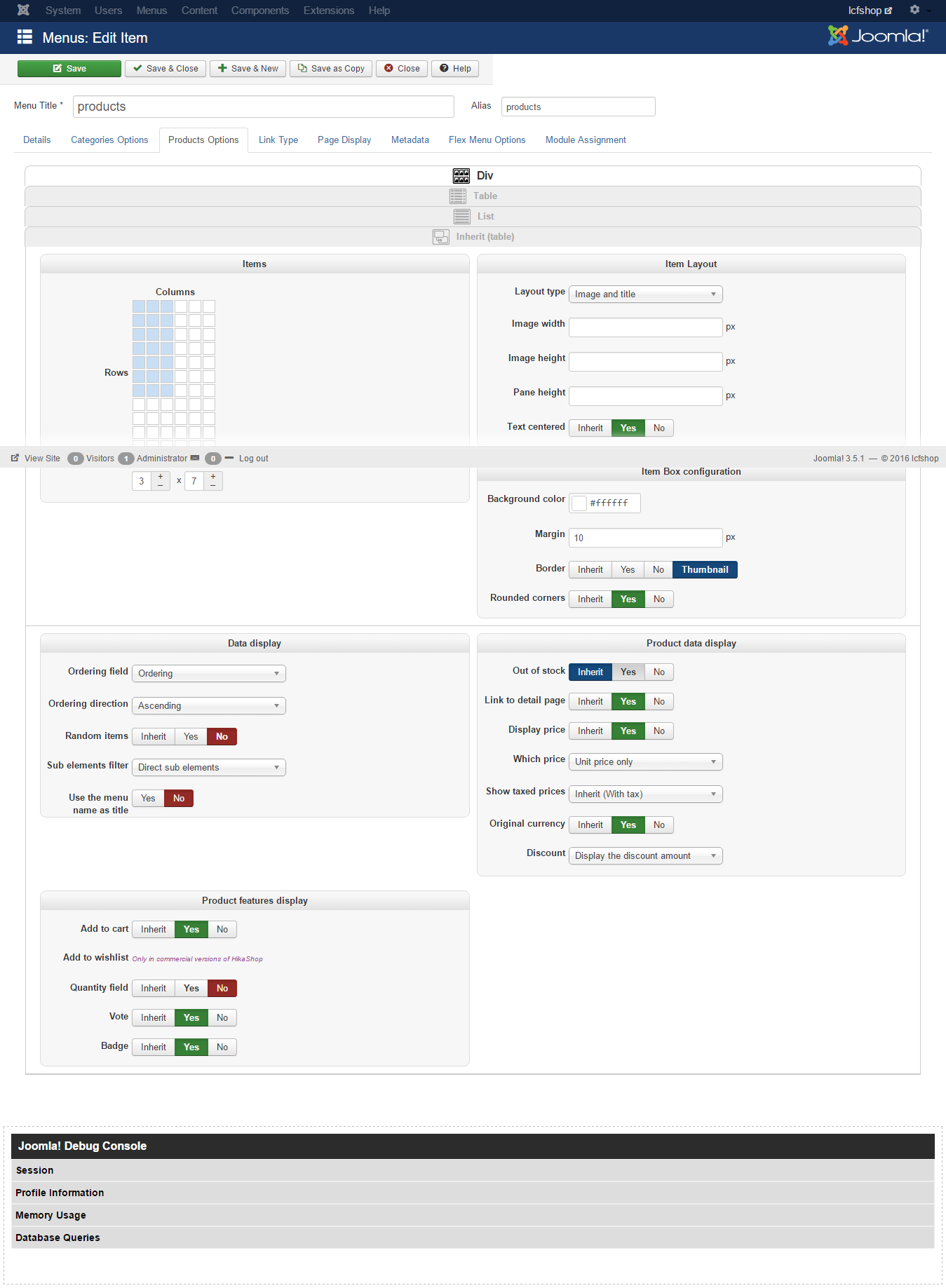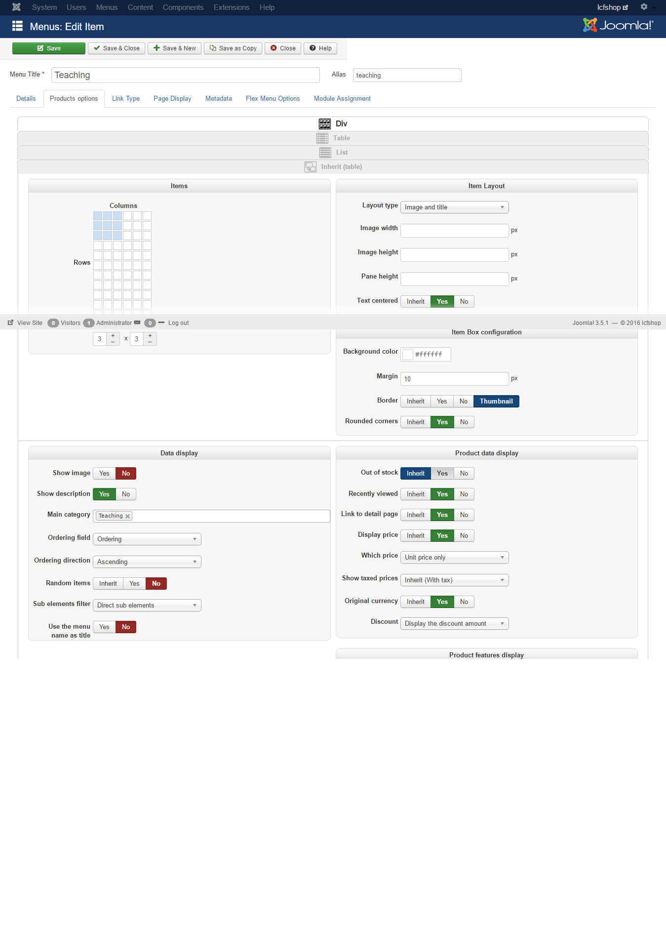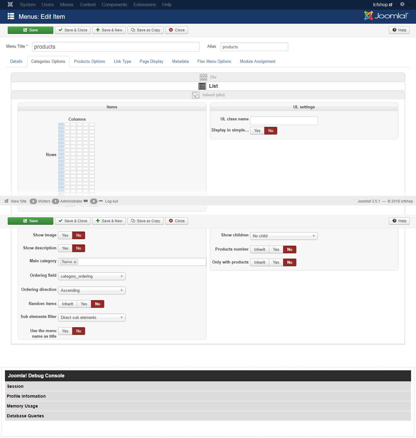 Please provide a screenshot of the settings under the categories options and the products options tabs of that menu item.