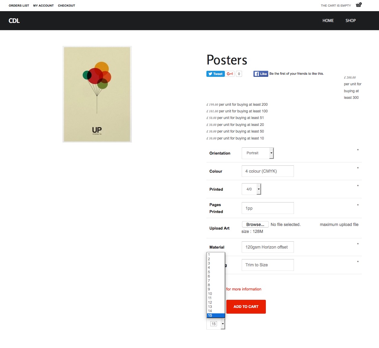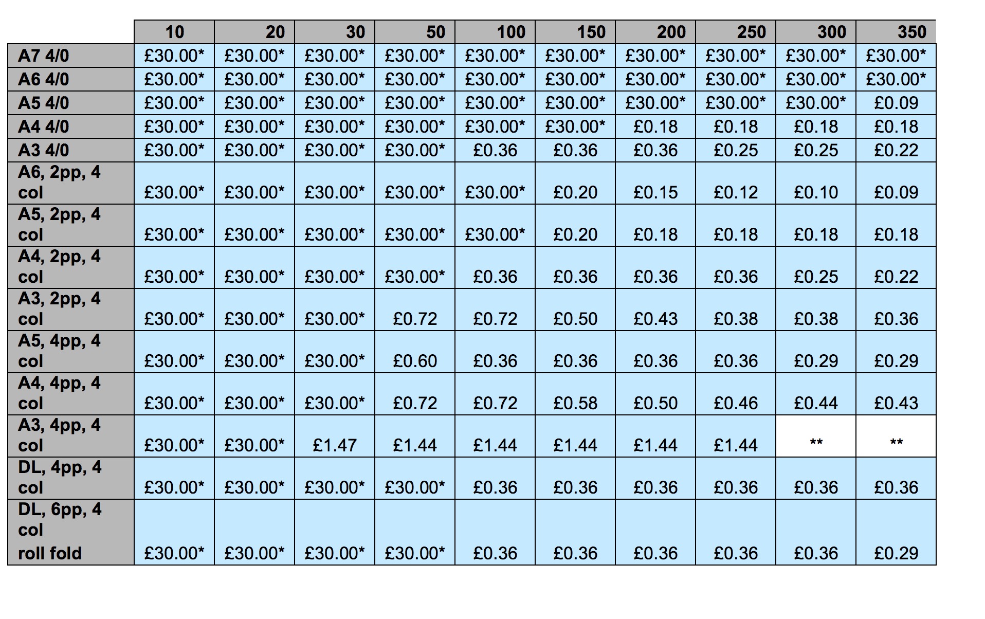 So for example - see line 4 A6, 2pp, 4 col - the prices is fixed to £30 for up to 100 units. Then the prices changes by calculation - for 150 units the price per unit will be £0.20.