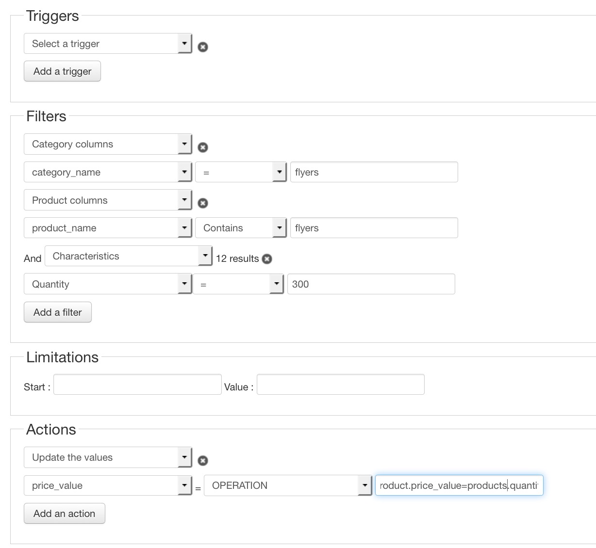 If it's not possible, I was thinking that adding Quantity as a charectiristic will allow me to set the quamtities with more freedom and using mass action to add the prices. In that case what would be the syntax in the mass action? See attached image - I have created the filters and then to change the price_value I did Update the Values -> Price_Value = Operation -> product.price_value=products.quantity*0.2