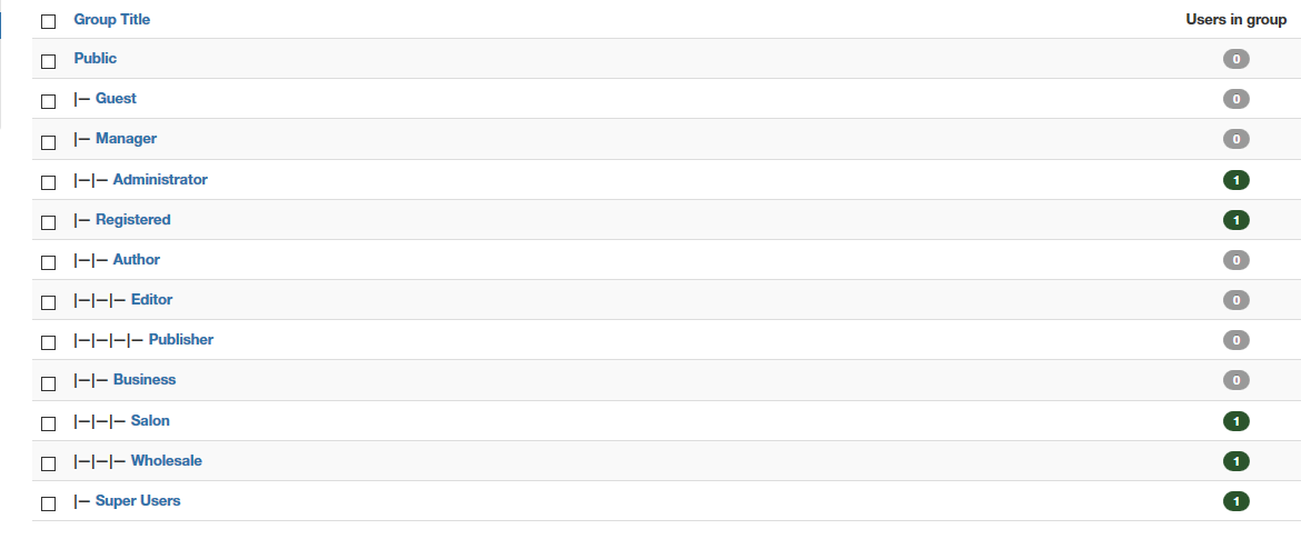1) I have set up the groups in Joomla as per the screenshot joomla-groups