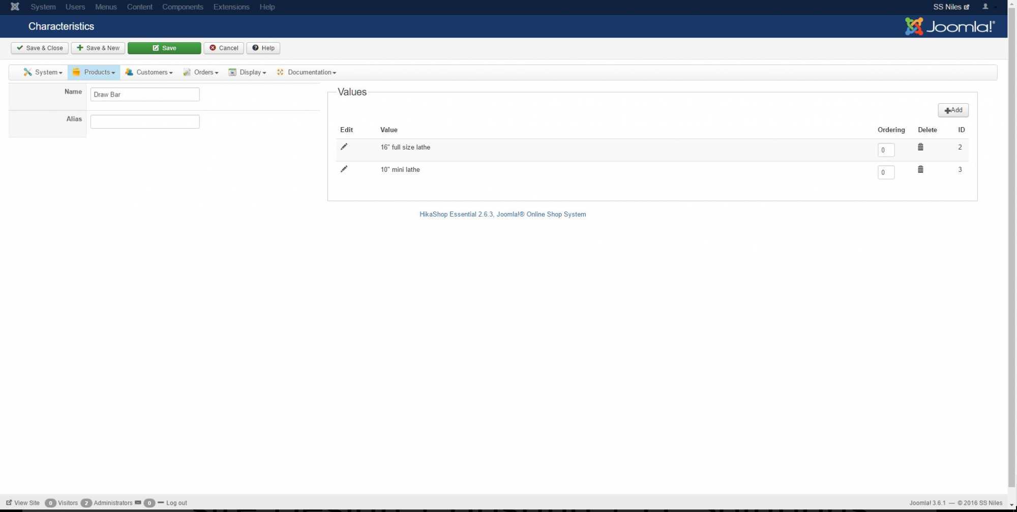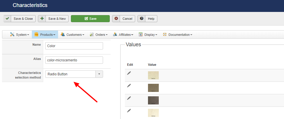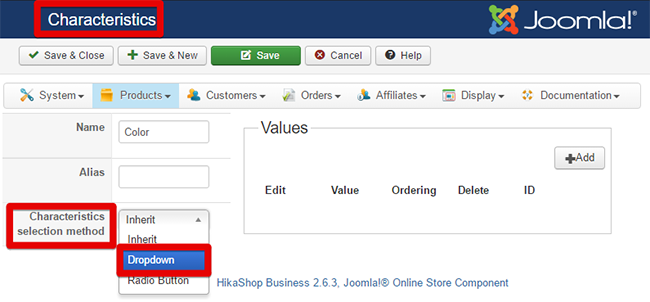 2) in Characteristics, the "dropdown" or "radio button" drop-down will appear for a particular characteristic.