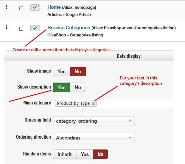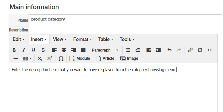 You have shown me where to enter the text for the category description however I do not see the option 'Main Category'