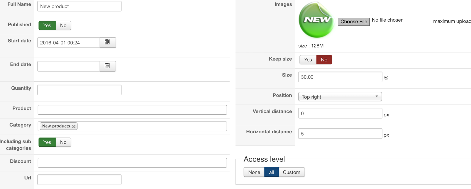 i created a badge for new products. for the category i created a category named "new products" which is empty. The new product category is root and not a sub of products or anything. i dont know if this is correct.