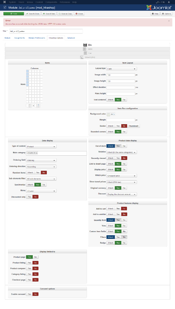 The error "An error has occurred while fetching the JSON data: HTTP 404 status code." doesn't come from HikaShop so I don't know why you have it but I don't think it is related.