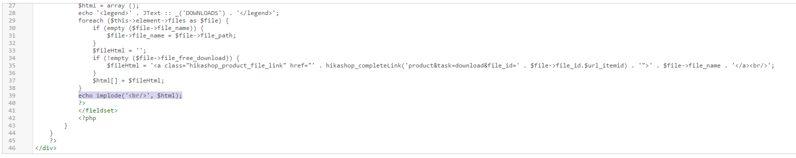 I have a product which has 12 paid for files and one free file. On the product page in the downloads section, it does not show the paid for items but inserts a BR tag for each one leading to a large gap on the page.