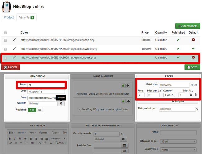 Second point, you have to duplicated your product, in order to only be use as option, so don't categorized their with your other products (categories => won't display them), add a variant in your product like this :