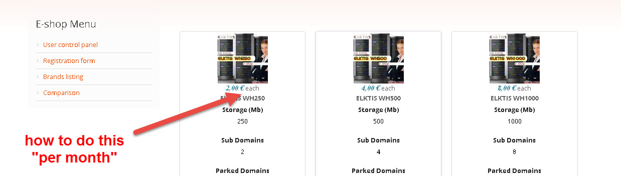 As i am selling some services that are rented by month or per month, as hosting streaming, etc.. I need to change the "each" on every item / product and change it with pay per month or just per month.