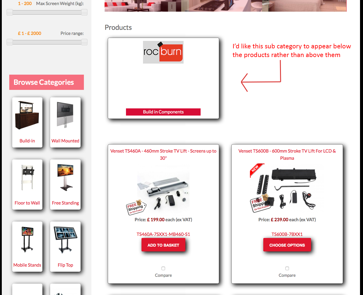 We have a category with some products in it and have just added a sub category with some more products (parts) in it. When I'm viewing the top category I currently see a sub categories followed by the products in the top category. I'd like to see them the other way round ie. products in top category followed by list of sub categories. I assume this is changeable in one of the view files but can't find it and I'm not sure what I'd need to change.