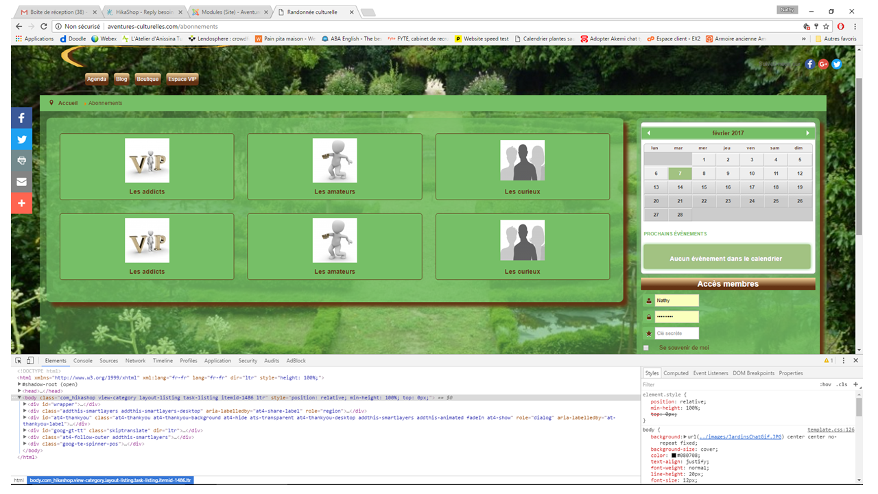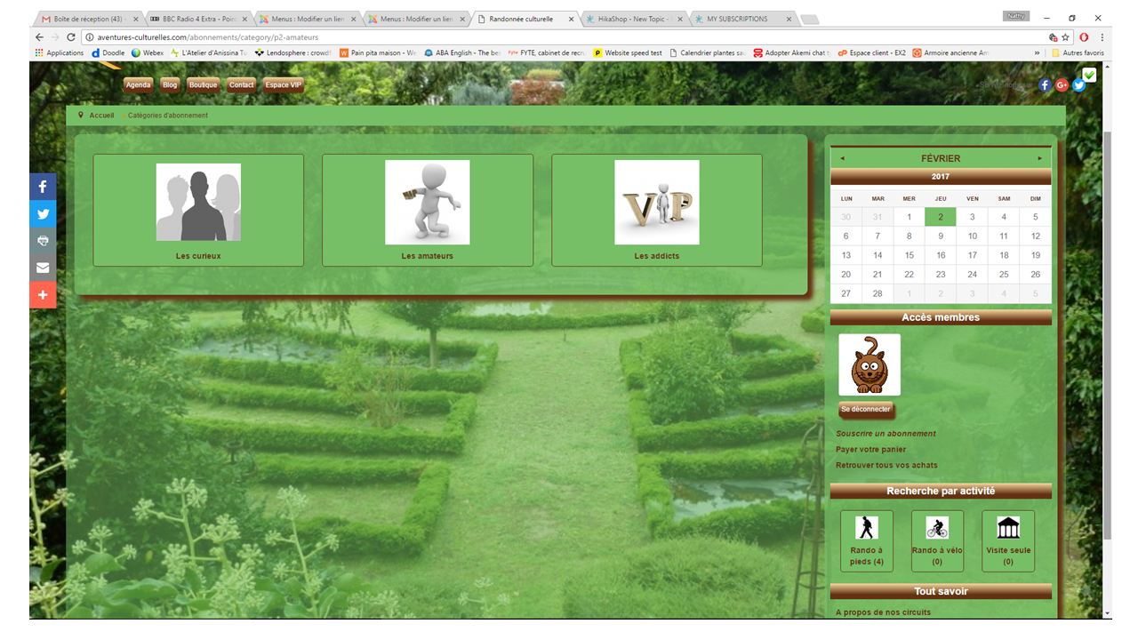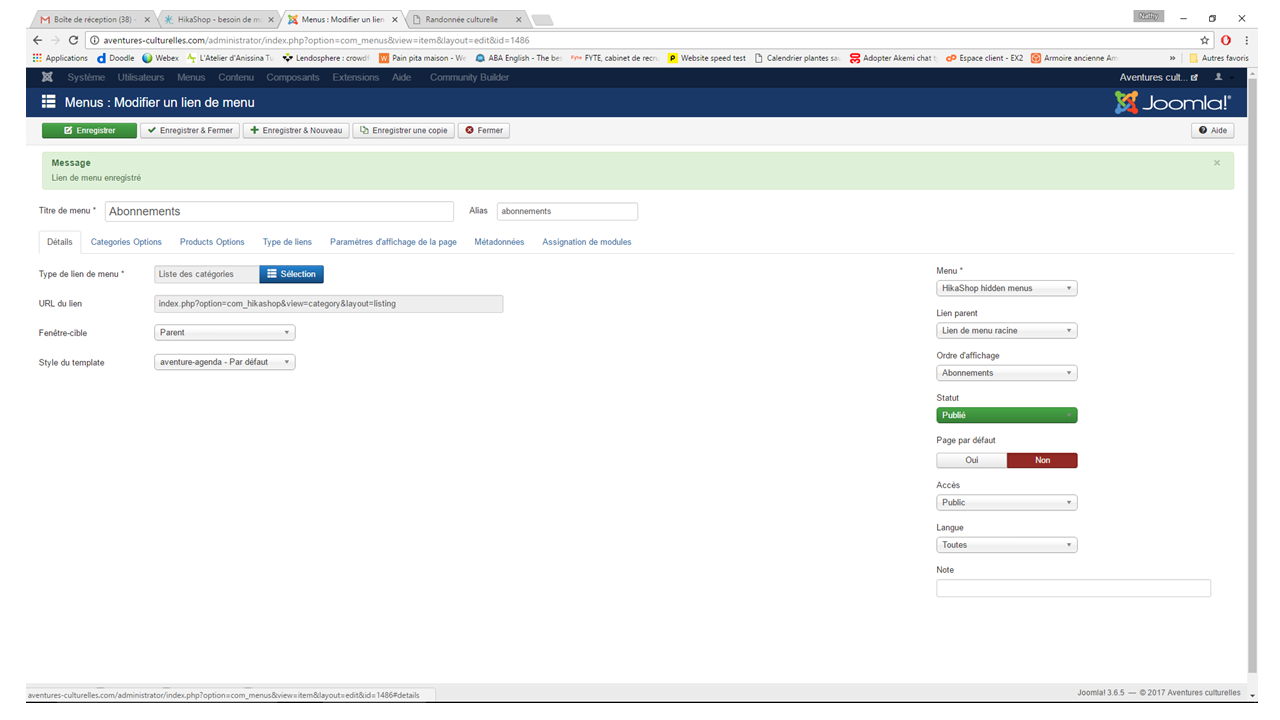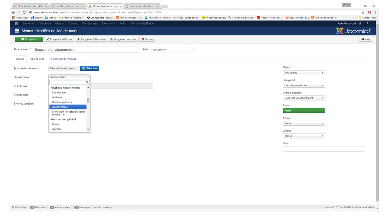 Mes menu et module de menu Joomla contenant le lien "Souscrire un abonnement" s'affiche à droite : le lien pointe vers le menu caché 'Abonnement".