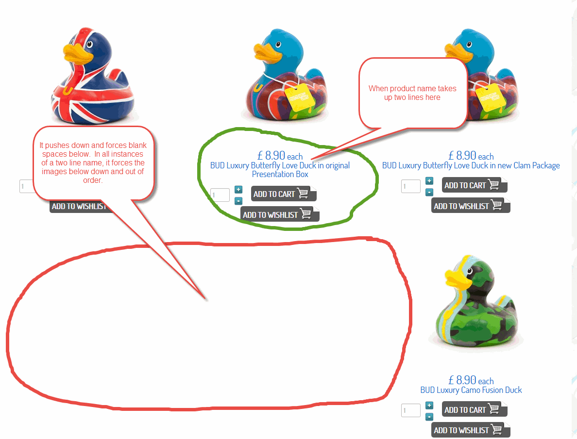 You can see an example of two-lines of product name forcing the product item below it out of the alignment scheme at this URL.