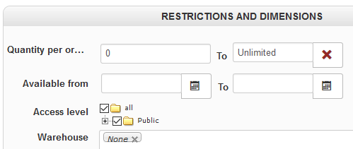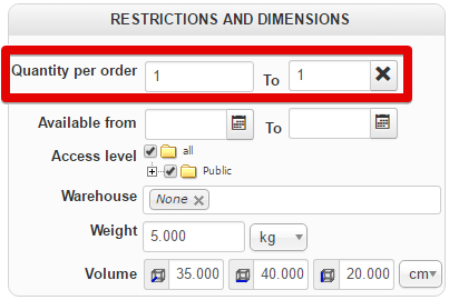 And unable your customer to buy 2 time the same product for the same order, you have to configure Restrictions and Dimensions part like this :