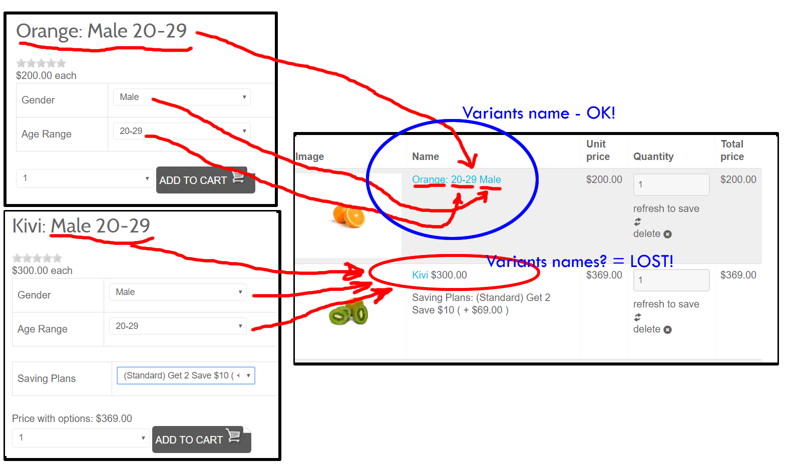 I expected to have the Name of Variants to be kept on the Checkout. It does keep it for Oranges but Not for Kivi.