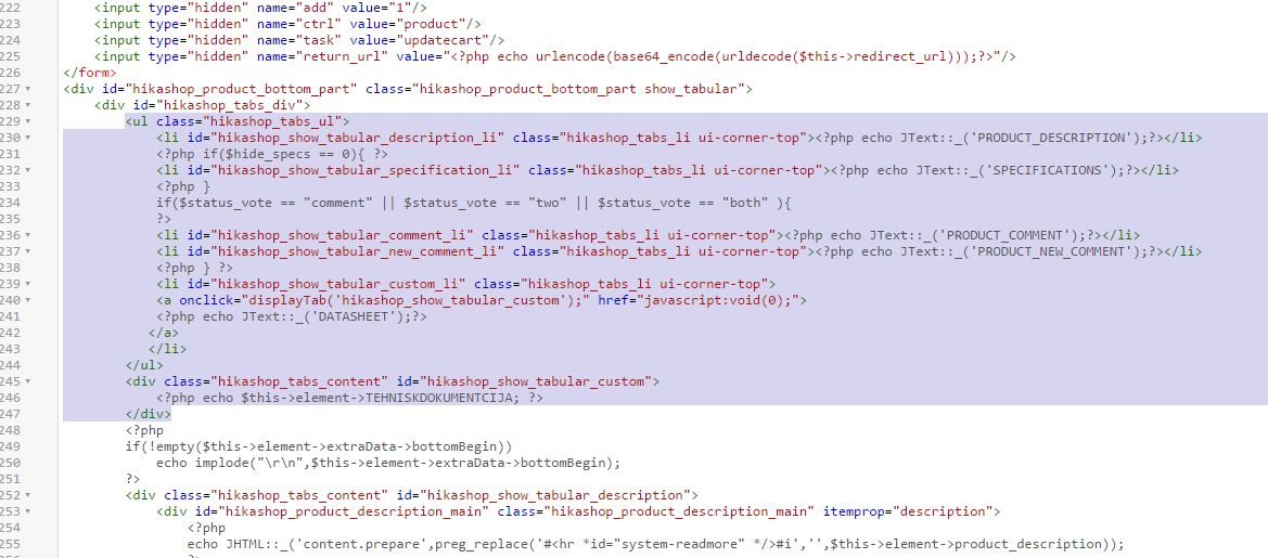 Hi. I know that the topic is not new (there are 2-5 yr. old outdated topics regarding this matter, but I could not find them useful). Thing is a got a client with Hikashop running on hi's website. I'm not quite experienced with this thing, therefore asking for your help. I have products displayed in tabular view, so far there are 2 tabs: Apraksts (Description) and Specifikacija (Specifications) (Yeah, it's sneaky Latvian). Thing is that I need to add another tab with custom field (Text). Any chance to get help please ? Also I do know that Hikashop is outdated on the website (2.6.4) but the client insists on keeping things as it is.
