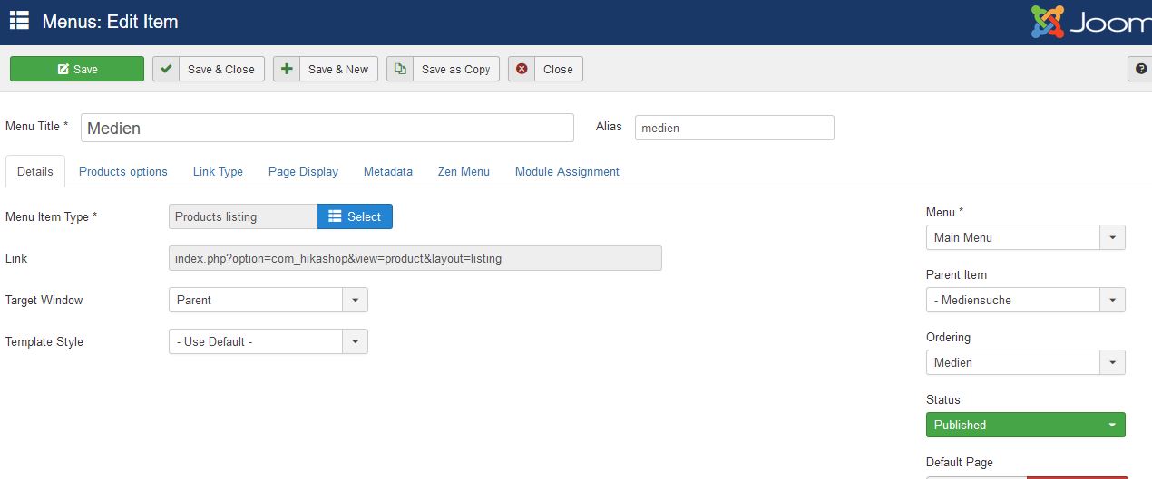 I added new categories and a new product. The link is "/hikashop-menu-for-categories-listing/product/einrichten-smartboard.html". I do not have a menu item alias called "hikashop-menu-for-products-listing". Where is the product page picking that up?