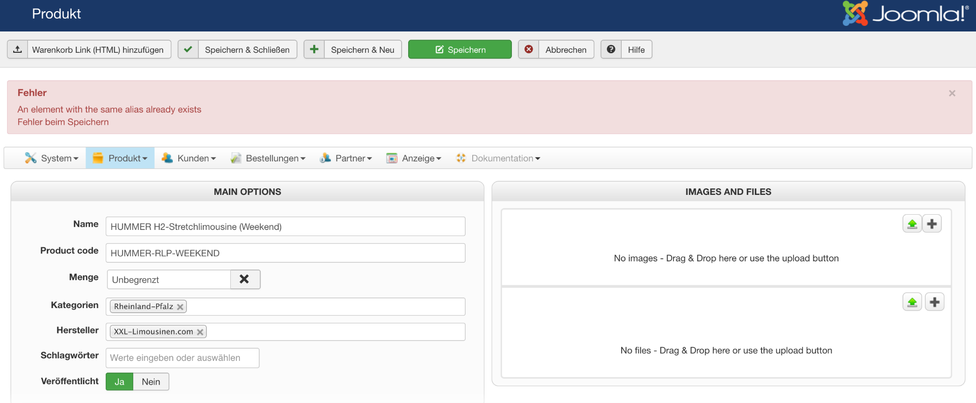 So make sure that the alias of the product is unique. Beware, we're talking about the "alias" field here, not the name, not the code.