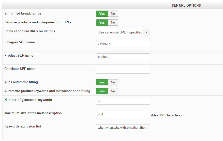 I am configuring Hikashop on Joomla 3.7.0 with "Search Engine Friendly URLs" and "Use URL Rewriting" options enabled.