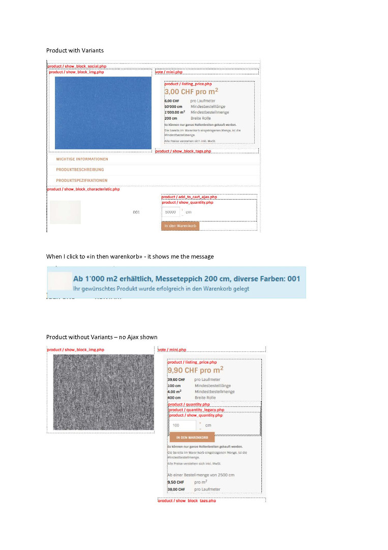 I found the setting "Display view files" and see that in the variants a "add_to_cart_ajax.php" is loaded, in the other not.