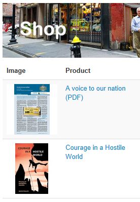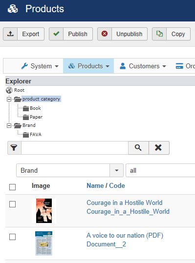 In the Components > HikaShop > Products page two products are listed: a Book "Courage in a Hostile World" and a Paper "A voice to our nation" in that order: