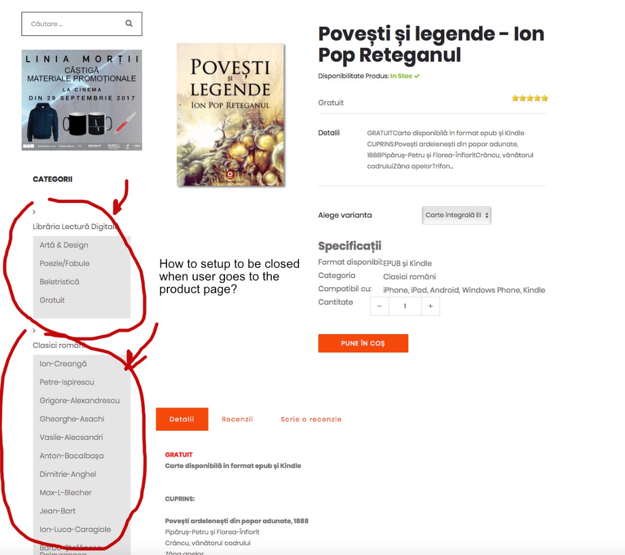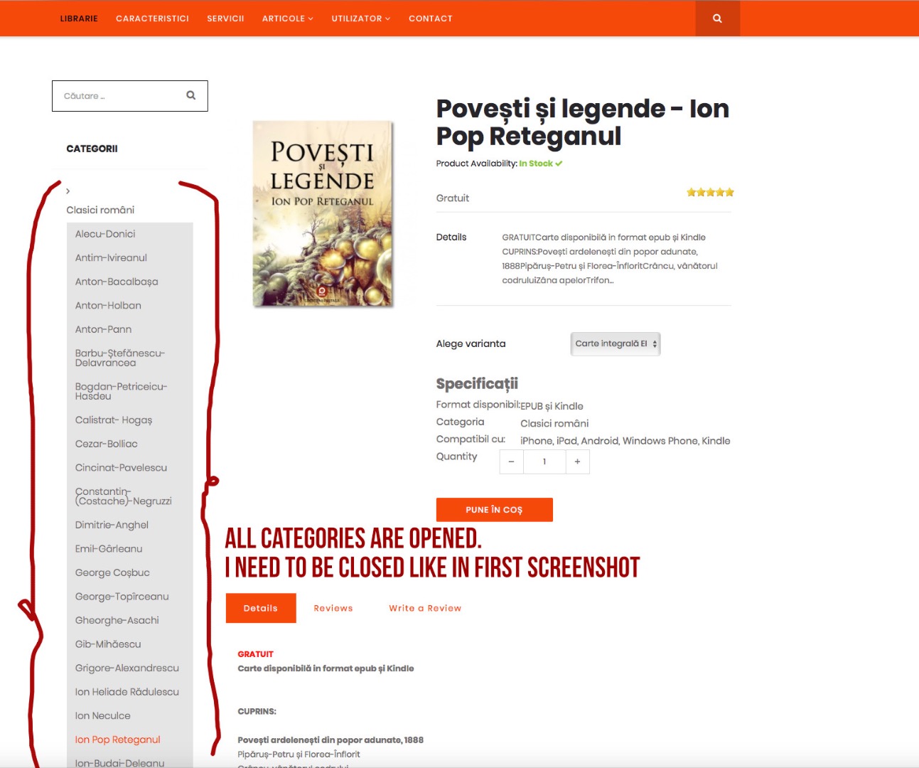 For example. I have a category named "Romanian Classics" and in that category I have a lot of subcategory, names of the romanian writers, Alecsandri, Alecu Donici, Creanga...... etc. When a user enter tha magazine it see the Main category "Romanian Classics" closed, he did not see the subcategories. He can see the subcategories only if he clcik on the main category and open it. Now, if he click on an product image from the magazine, he goes to the product page. Now, in the product page, main category and subcategories are all listed. I need that the main category to be closed when a user goes to the product category. I will put some attach. Main page where all categories all closed, and product page where all categories are opened and I need to be like in first attach.