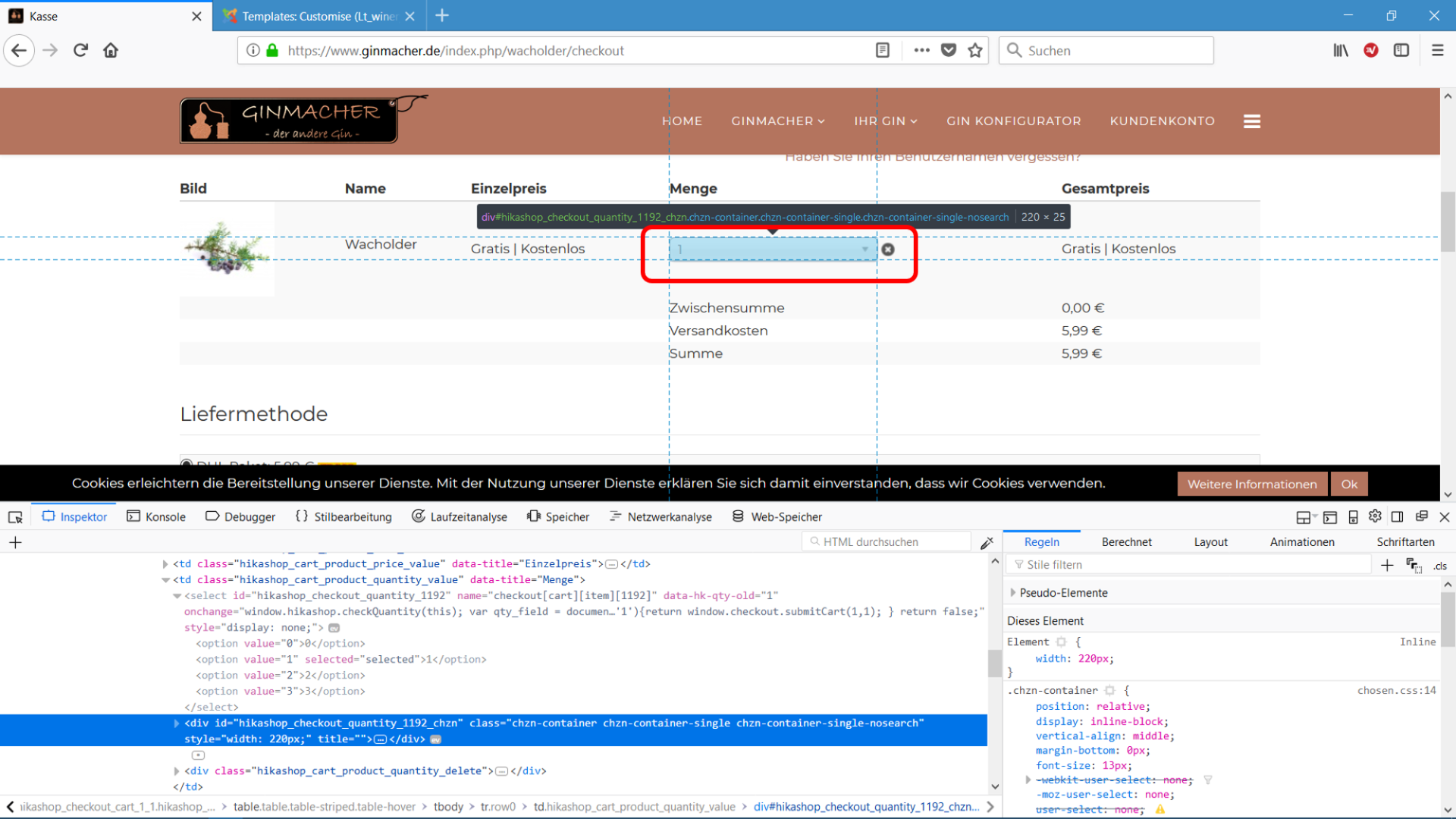 Can you support here as well (same issue, but at the checkout). I tried to give you all req. information in the screenshot. I tried to adap your CSS doe to this qty field as well but somehow I miss something here, that this field will also change from 220px to 50px.