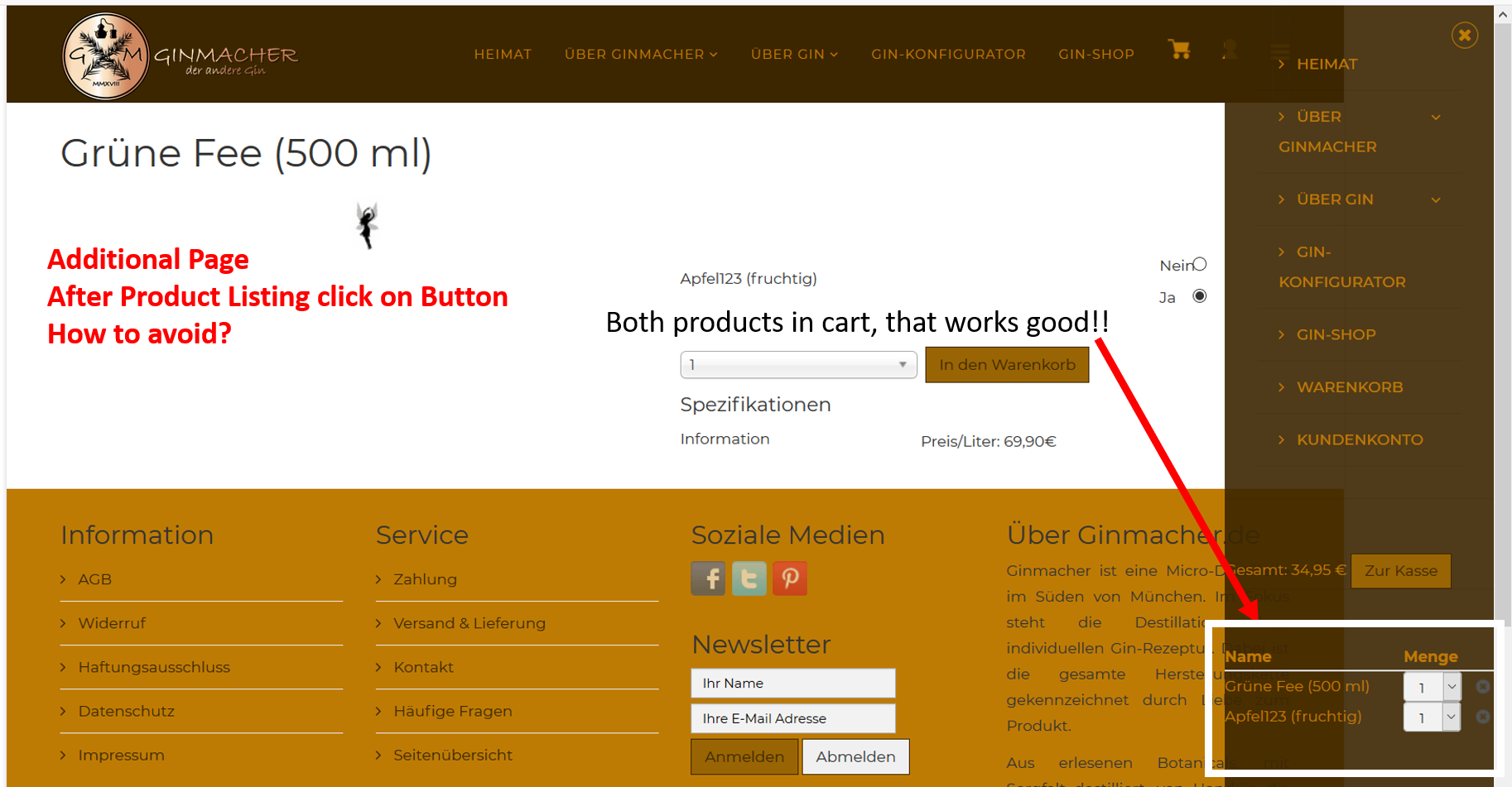 Now at the first product which is called Gruene Fee the view is now different as there is no add to cart button anymore - instead there is now the choose your option button, but behing the product picture. If I click this button, the next page apperas where I can now put the option into the cart. After click two products are in the cart - that's good!