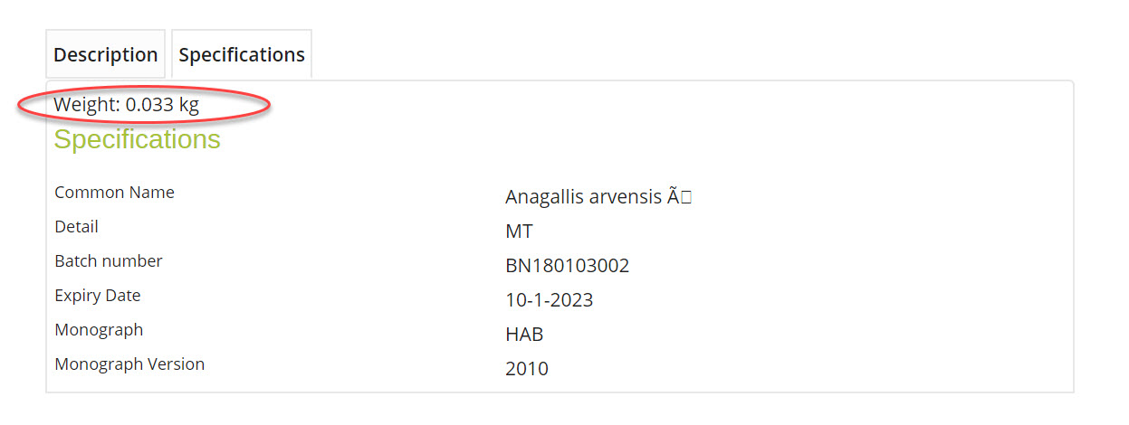 When we use the layout on productpage "tabular" we see that the weight of the product is standard displayed above the specification title.