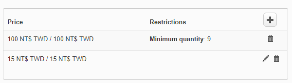- One price with the "Price" option set to $15 and the "Quantity" option to 1