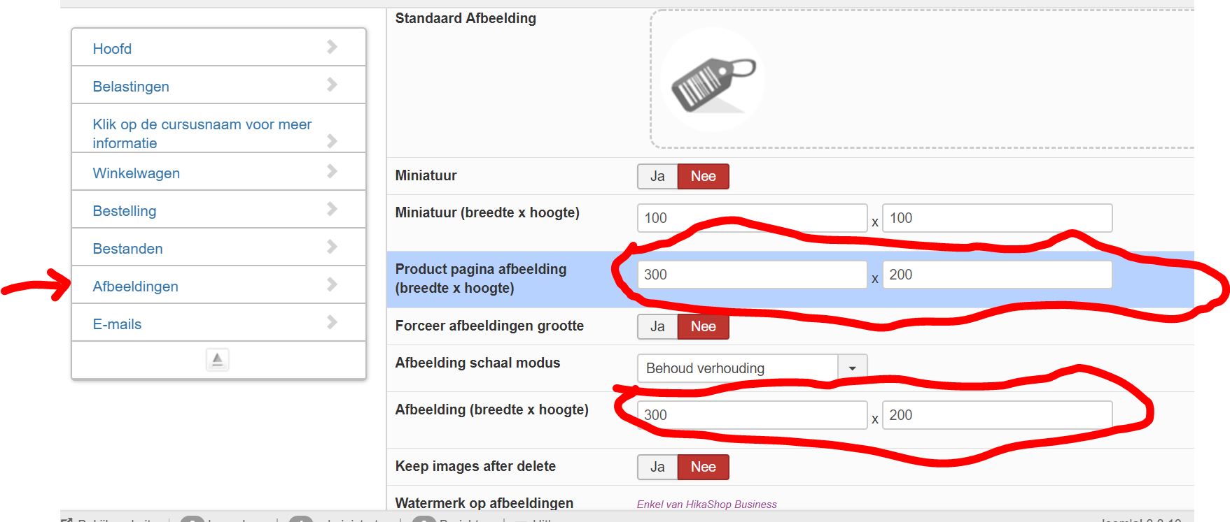 Ik wil op de productpagina de maat van de afbeelding 300 x 200 hebben.