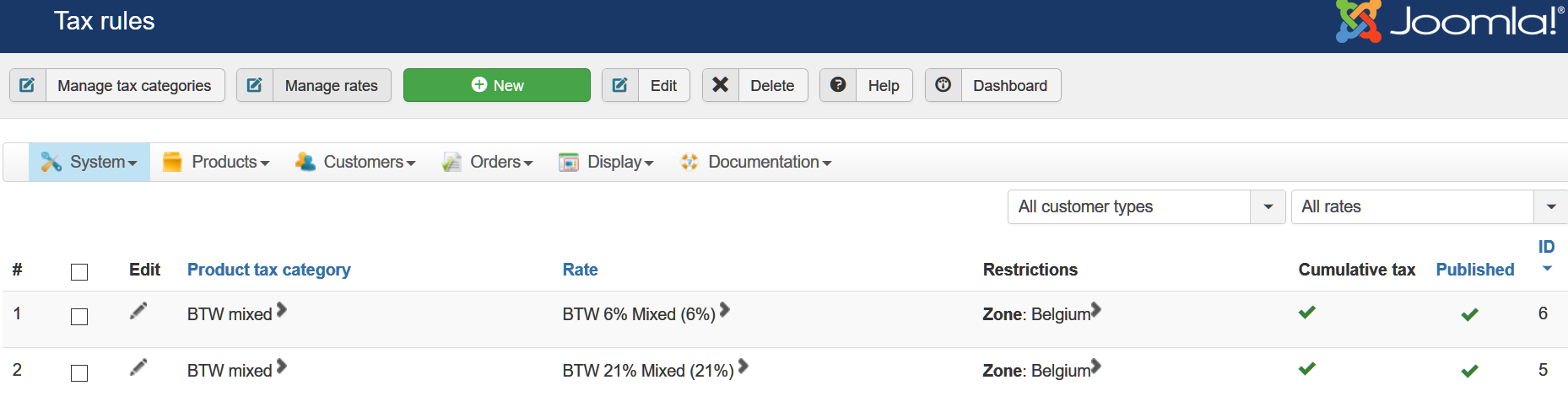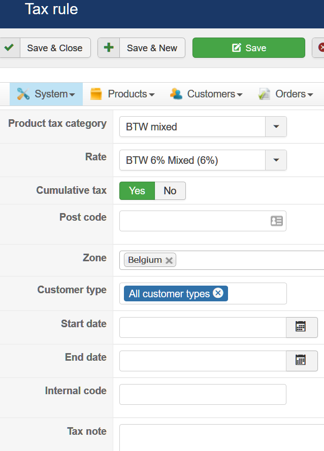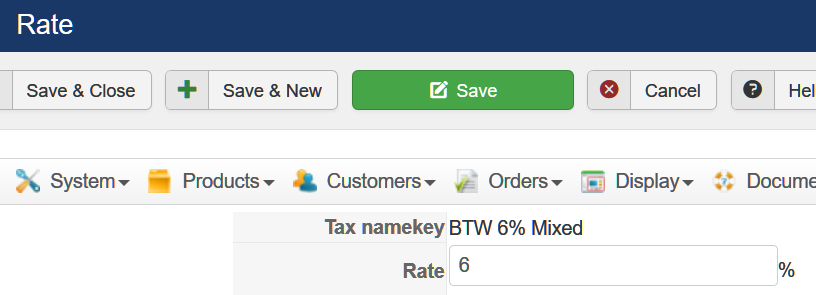 - create a product which will be the main product with the price being low VAT part of the total price. In it, select a tax category for the low VAT rate.