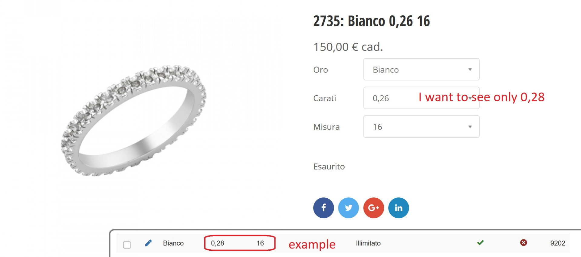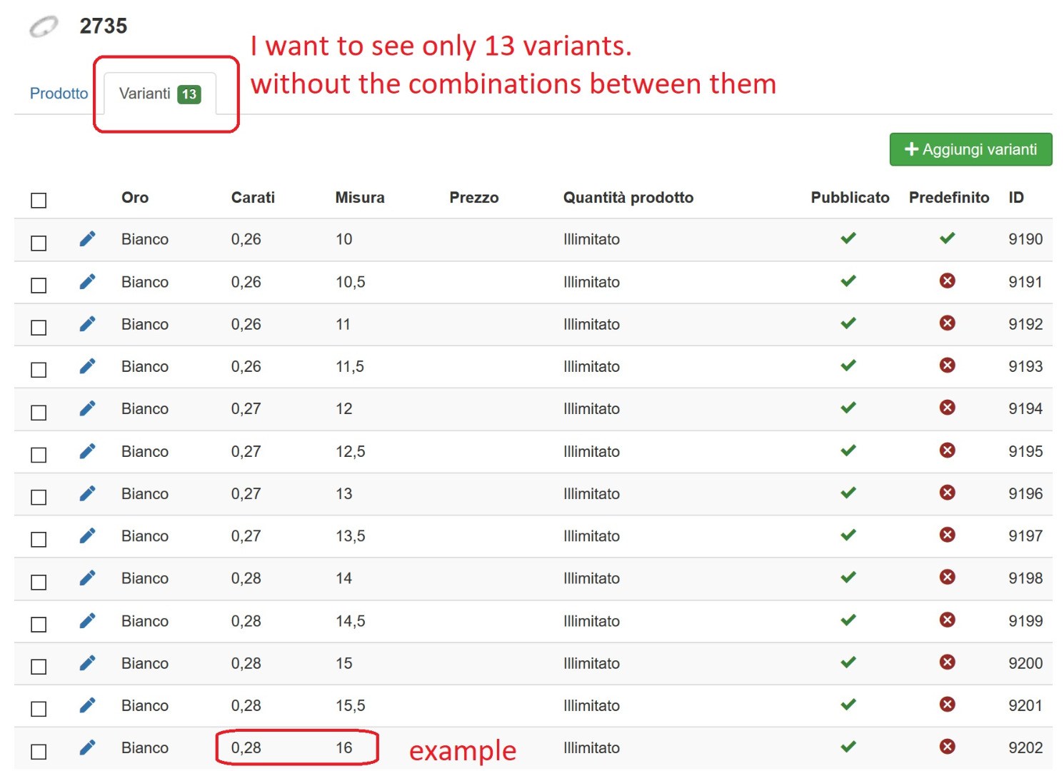 Because you have "Bianco - 0.26 - 10", when the customer select Bianco, it can choose "0.26" but once these two are selected, if we follow the logic of the feature ; the misura "16" wouldn't be available.