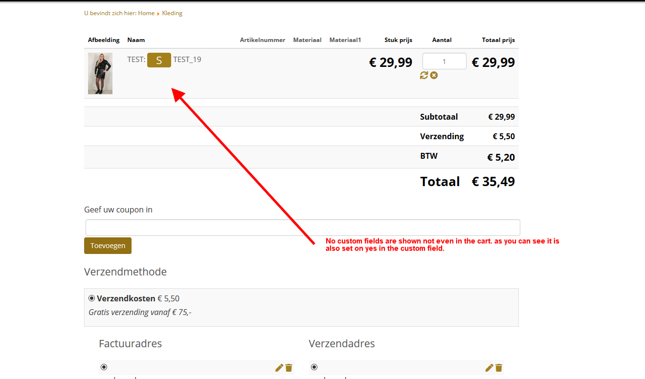 In the custom fields we set the settings that they have to be shown in the emails. But in no email even not in the cart the custom fields are not shown..
