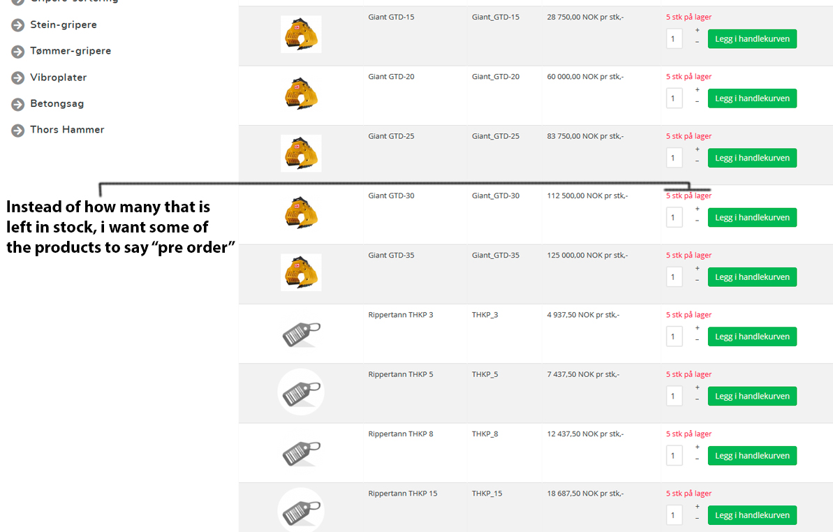 Instead of how many that is left in stock, i want some of the products to say "pre order" as shown in the attachment.