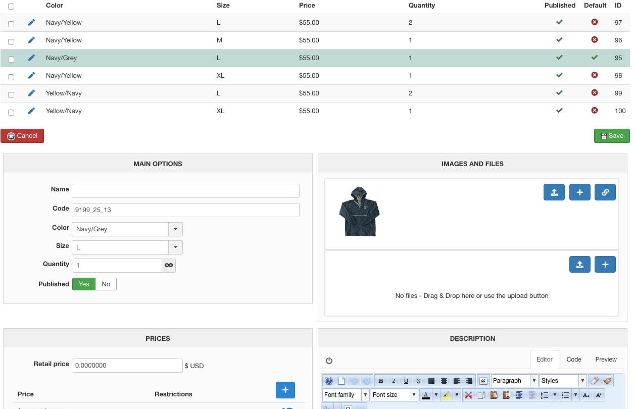 One thing I've noticed is that the color and size variants don't seem to be related. For instance, I have a 'medium black' jacket and an 'extra large blue' jacket. In the front end of the store, the color in the dropdown and the correct colored product are connected, the default product set, and the variants set up.
