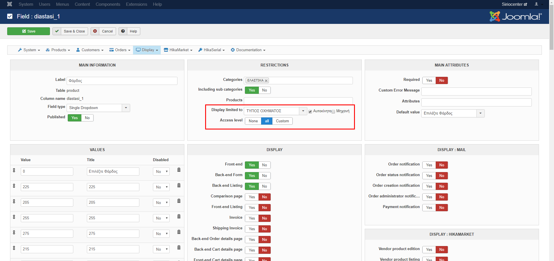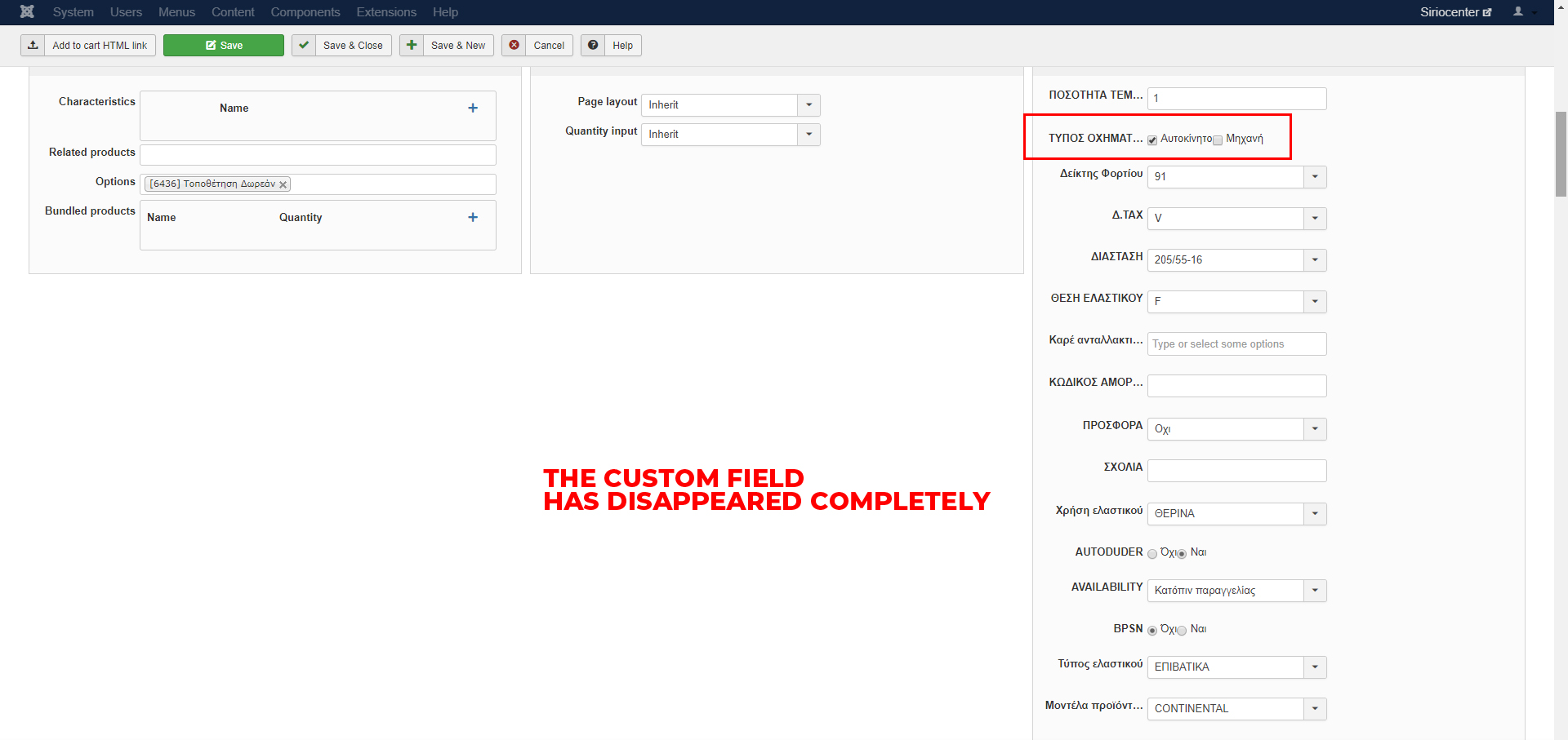 if i set the custom field as "Display limited to" ΤΥΠΟΣ ΟΧΗΜΑΤΟΣ=Αυτοκινητο (see image 1) and after that i edit a product that has checked ΤΥΠΟΣ ΟΧΗΜΑΤΟΣ=Αυτοκινητο the custom field "Επιλέξτε Φάρδος" does not exist in the backend of the product.