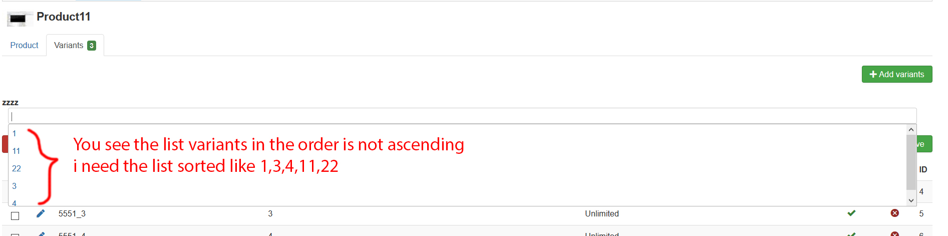i need the variants list sorted like 1,3,4,11,22