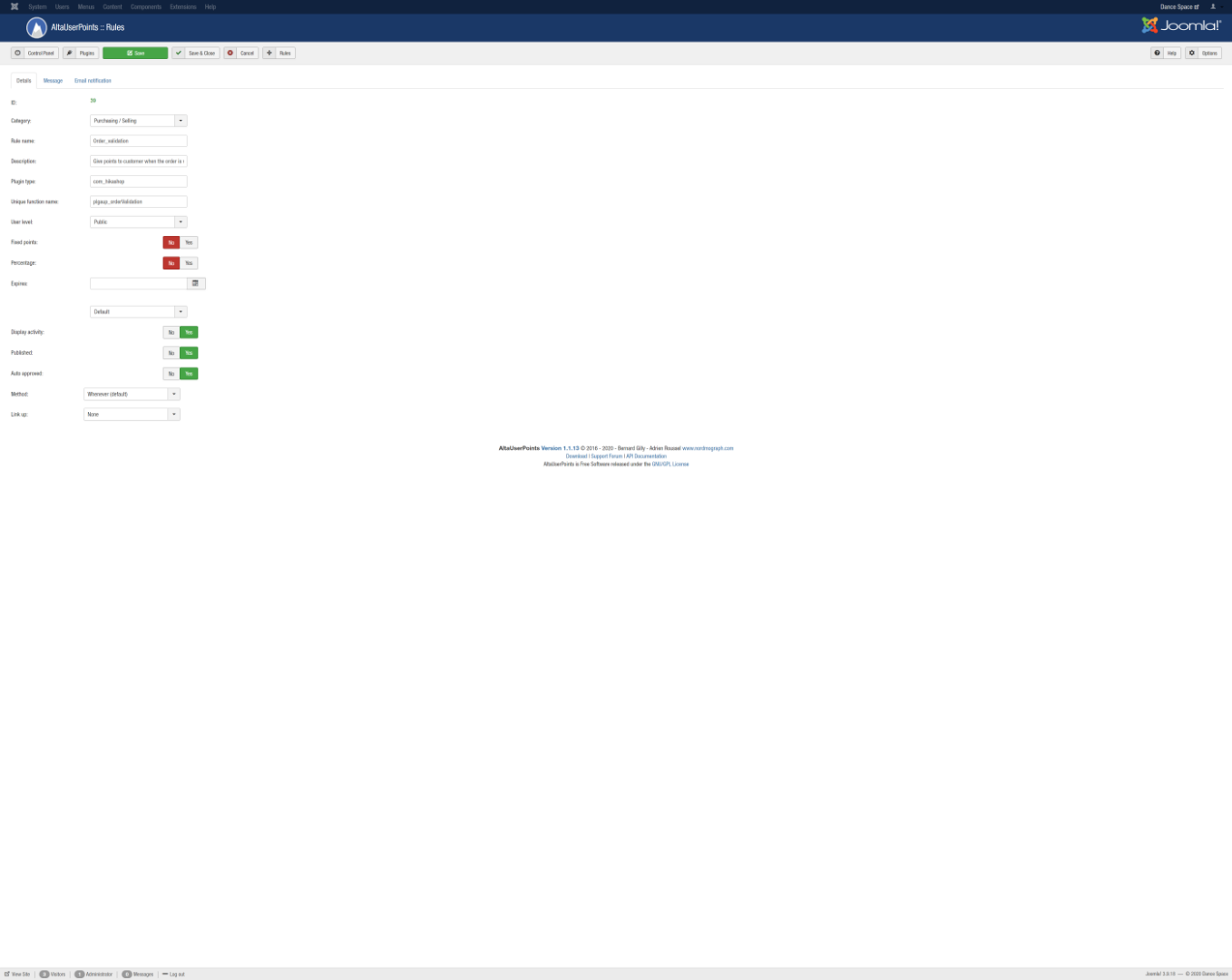 Hello Nicolas! I use Alta User Points on the site, and a plugin for purchase on Hikashop, which accrues points depending on the number of purchased goods .. like this is written in the instructions for this plugin -
