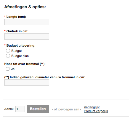 We need to add a product in a shop that is custom made. A customer can order this product by entering a lenght and width, and the price is calculated with these values. Price should be visible before adding the product in the shoppingcart. Besides this, the product has several options (think something like a choise in material where the product is made of). Price will change depending on the chosen material. I've added a screenshot of how it should be (it is in dutch, sorry, but I think it still gives an idea of the wishes).