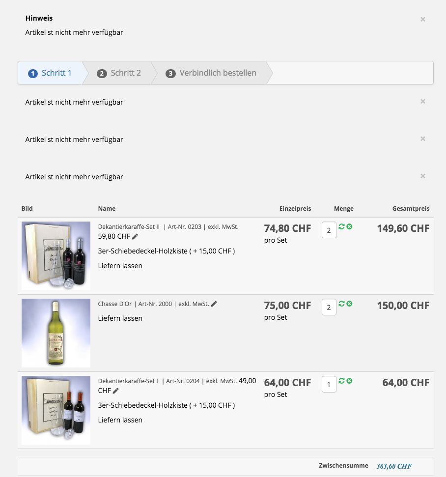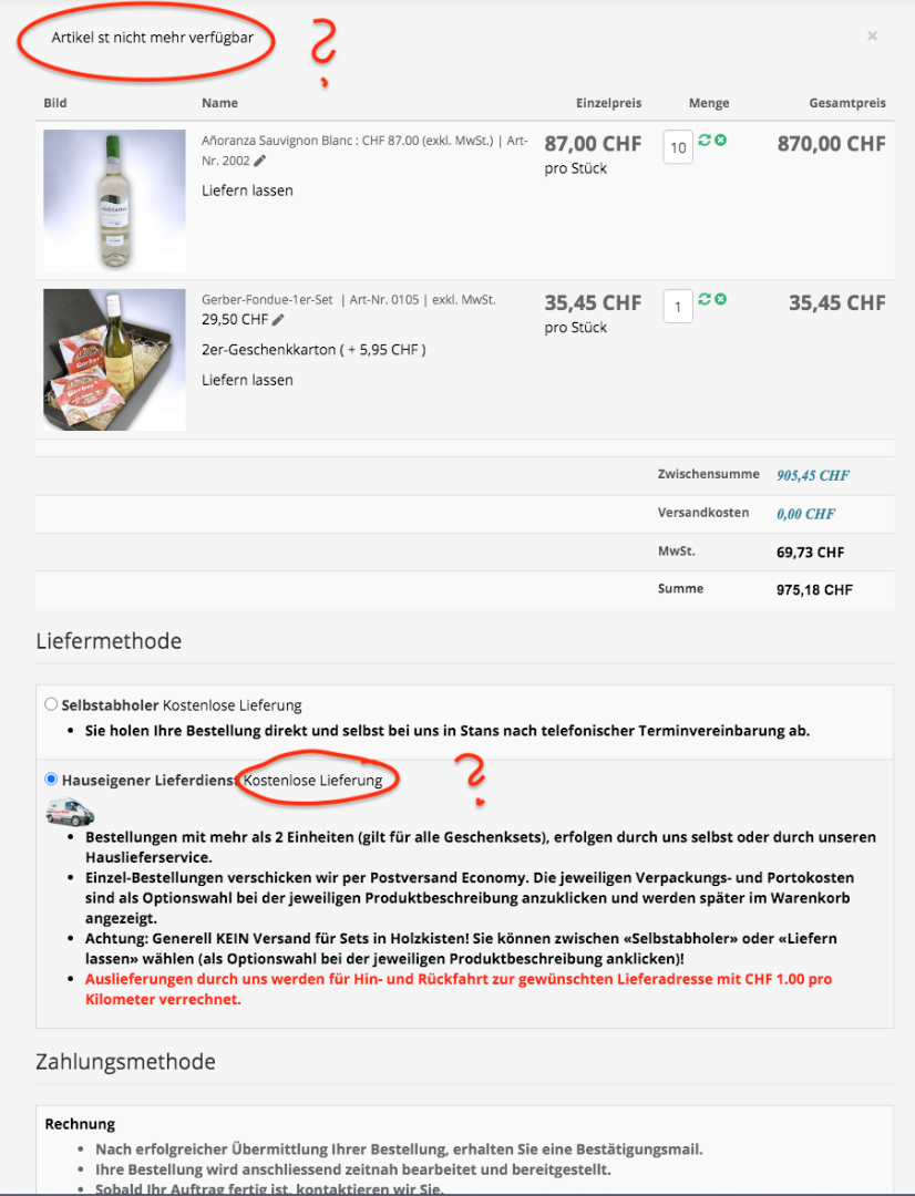 Note: The shop is generally only used to accept orders, as the customer has a split payment system (WIR payment for the wine prices, the rest by invoice. This is - as I think and solved it - so far ok.