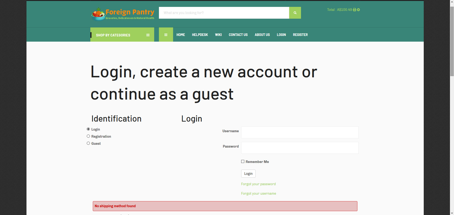 I just tried that, however, no matter which checkout method I select - login, registration or guest - I get an error message, right below the form, saying: no shipping method found. That message only goes away, after I've logged in.Then I get a choice of all available delivery options, i.e. "Local Delivery" or "Australia Post".