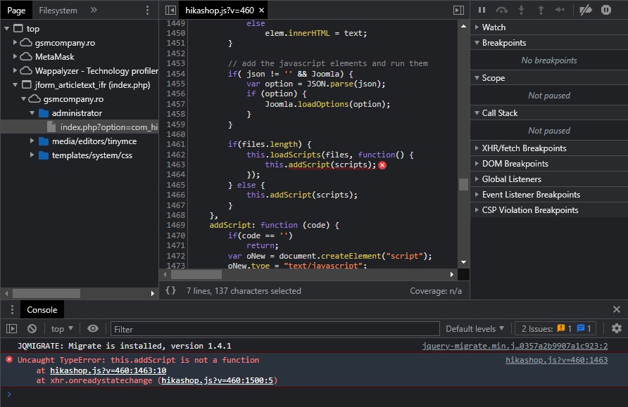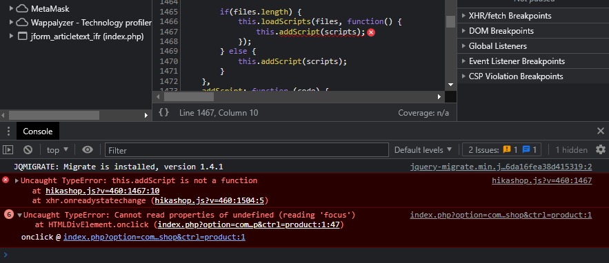 Uncaught TypeError: this.addScript is not a function at hikashop.js?v=460:1463:10 at xhr.onreadystatechange (hikashop.js?v=460:1500:5)