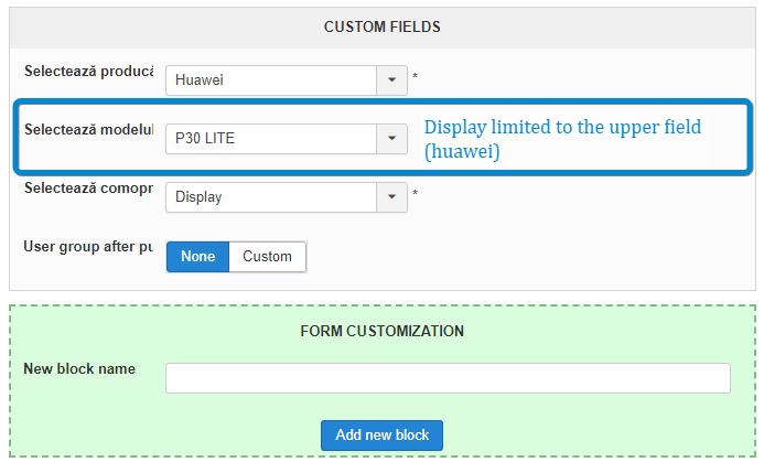 3) Model: ( P30, P30 LITE) Display limited to custom field 1 if = huawei