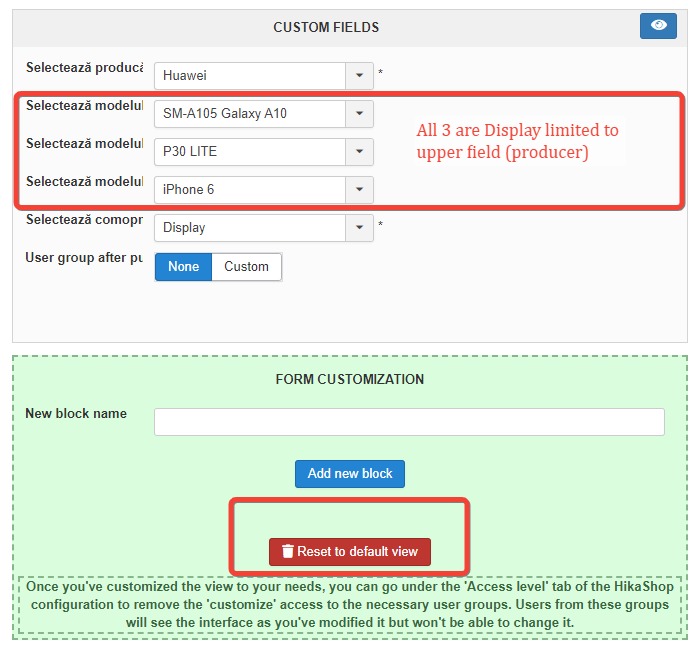 After I select my options and save the product, a new FORM CUSTOMISATION it is created and all the custom fields with "Display limited to" are visible.
